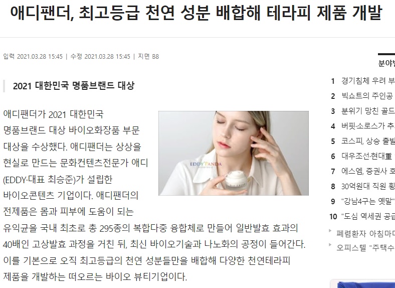 애디팬더가 2021 대한민국 명품브랜드 대상 바이오화장품 부문 대상을 수상했다. 애디팬더는 상상을 현실로 만드는 문화컨텐츠전문가 애디(EDDY·대표 최승준)가 설립한 바이오콘텐츠 기업이다. 애디팬더의 전제품은